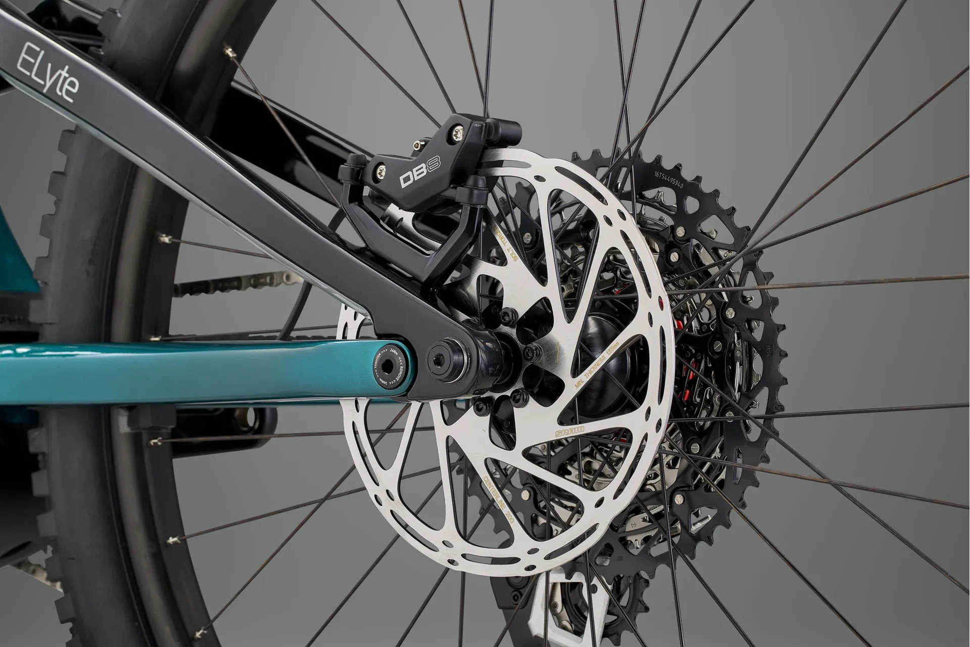 The ELyte EVO RS is dressed in a curated parts list of trail-proven, real-world kit that performs out of the box and as well as for the long haul: RockShox Lyrik Select+ fork and Deluxe Select+ rear shock deliver exceptional rough terrain control; SRAM Eagle T-Type 1x12 gearing, Maxxis tyres, feedback-rich SRAM DB8 four-piston brakes, and more. Our own custom suspension from RockShox has also been meticulously tuned to deliver you outstanding, ground-hugging grip with the support you need right from your first pedal stroke.